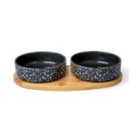 Διπλό κεραμικό μπολ 500ml μαύρο με ξύλινη βάση. Πλένεται στο πλυντήριο πιάτων ενώ η βάση μπορεί να καθαριστεί με πανί.