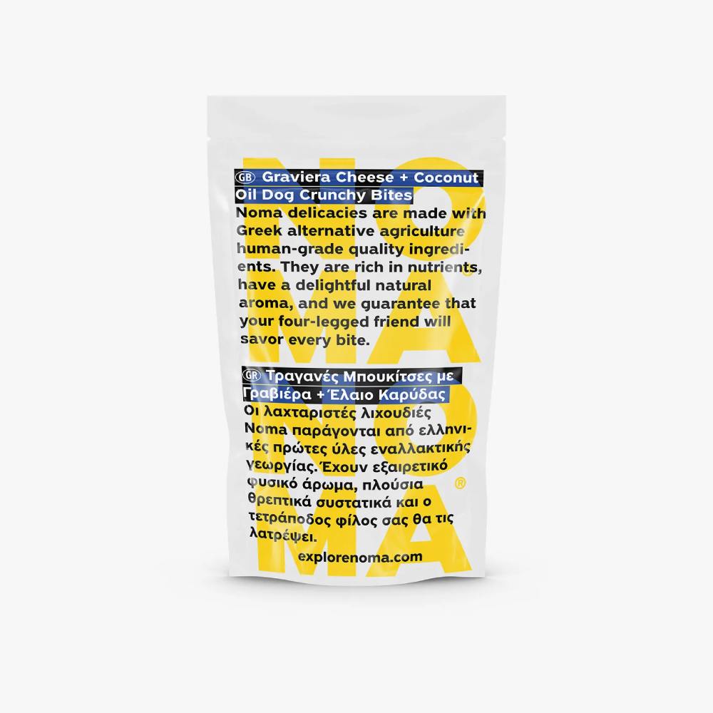 Οι λαχταριστές λιχουδιές NOMA με γραβιέρα και έλαιο καρύδας σε μορφή και υφή mini κριτσινιού, παράγονται από ελληνικές πρώτες ύλες βιολογικής γεωργίας. Έχουν εξαιρετικό φυσικό άρωμα, πλούσια θρεπτικά συστατικά και ο τετράποδος φίλος σας θα τις λατρέψει.